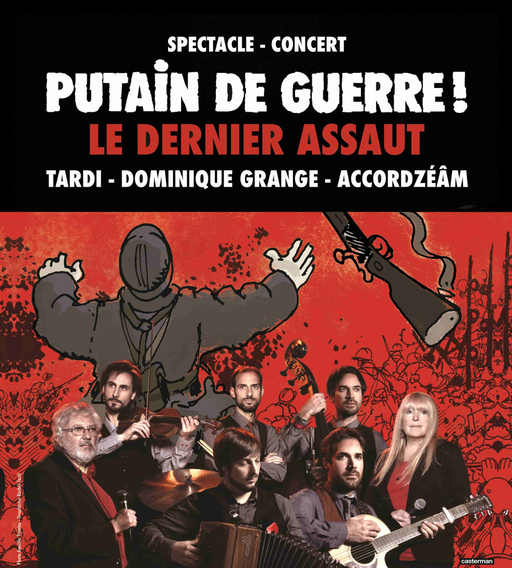 Chaque texte écrit et lu par #Tardi précède une des chansons qu’interprète #DominiqueGrange, magnifiquement accompagnée par les cinq musiciens du groupe Accordzéâm : des chansons mythiques de la Grande Boucherie 14-18 comme « La Chanson de Craonne » ou « Gorizia » (écrites au front par des combattants anonymes), des textes signés d’auteurs célèbres (Aragon, Brecht, Sébastien Faure, mais également l’auteur compositeur écossais, Eric Bogle)… Et aussi des chansons originales, écrites et mises en musique par Dominique Grange.