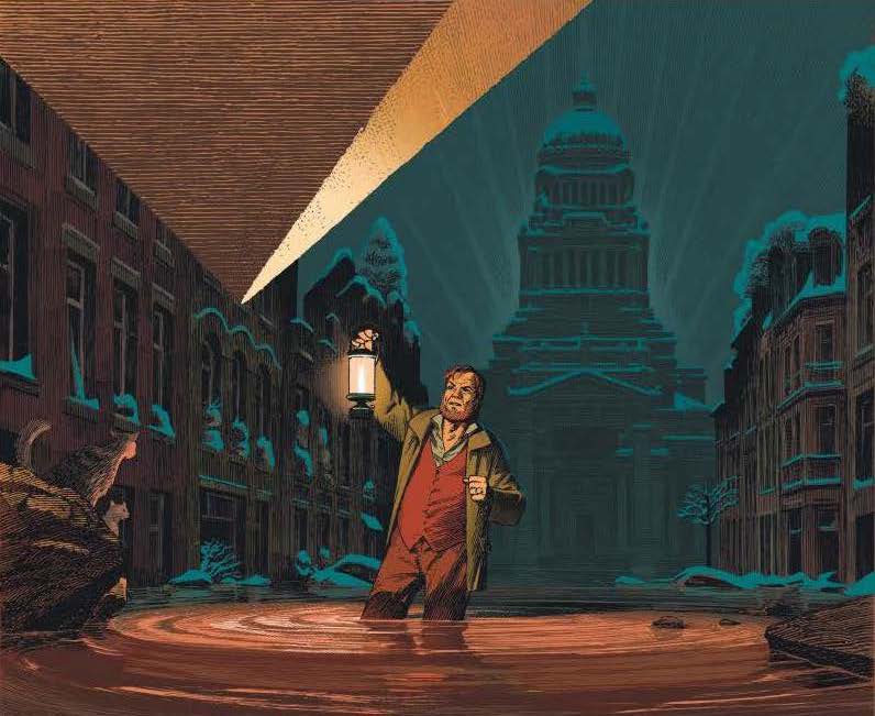 cette illustration due à François Schuitten, où l’on voit « son » professeur Mortimer observant une pyramide inversée, avec en arrière-plan le palais de Justice de Bruxelles (vu l’amour pour cette ville par l’auteur, on n’en est pas surpris!)