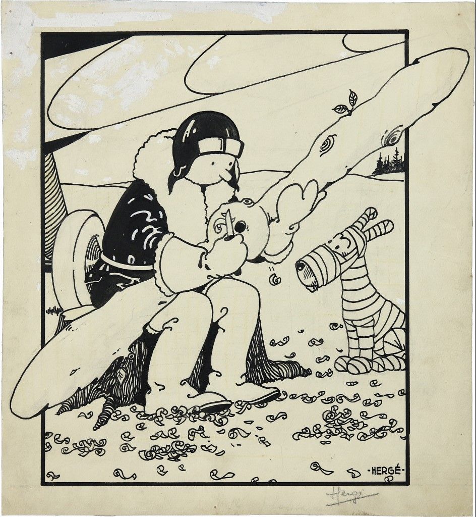 Publié le 13 février 1930, ce dessin illustrant la 1er aventure de Tintin montre le personnage créé par Hergé en reportage au pays des Soviets, en train de tailler dans un tronc d'arbre une hélice de fortune pour son avion, tandis que Milou, couvert de bandages, l'observe.