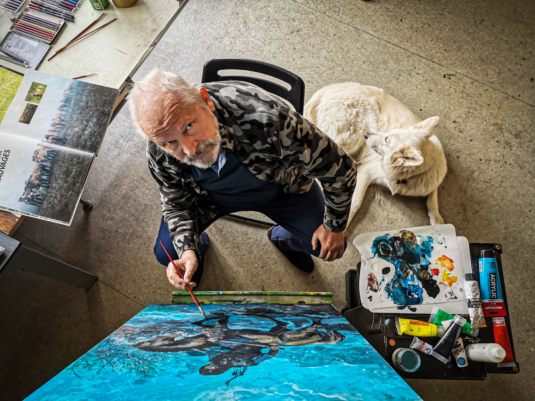 Enfin, dans son atelier suisse, l'heureux retraité de la série peint... (ici la couverture d'une intégrale de son oeuvre qui parait en Pologne).