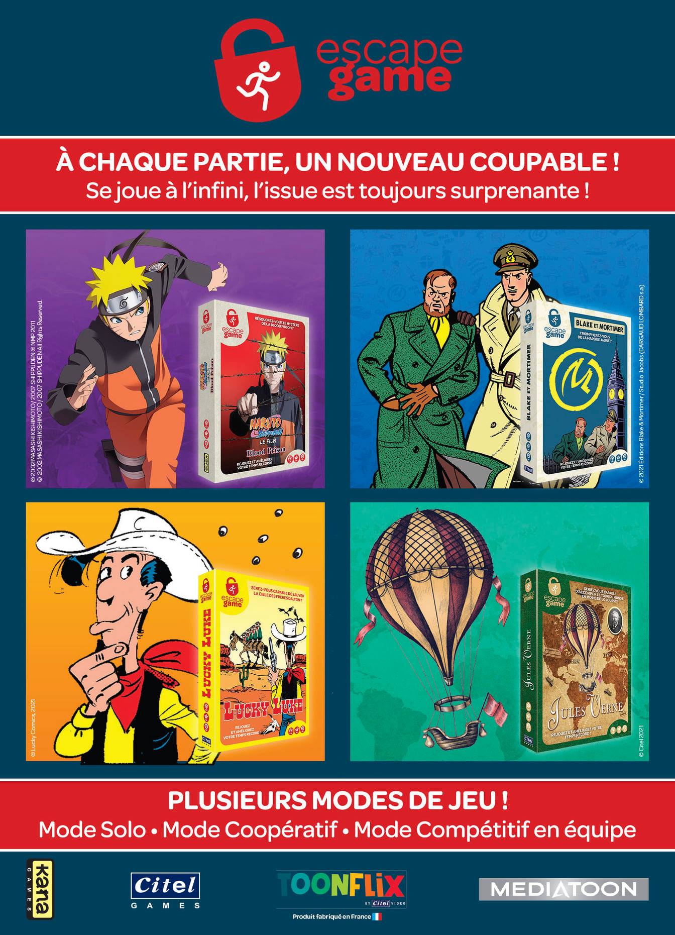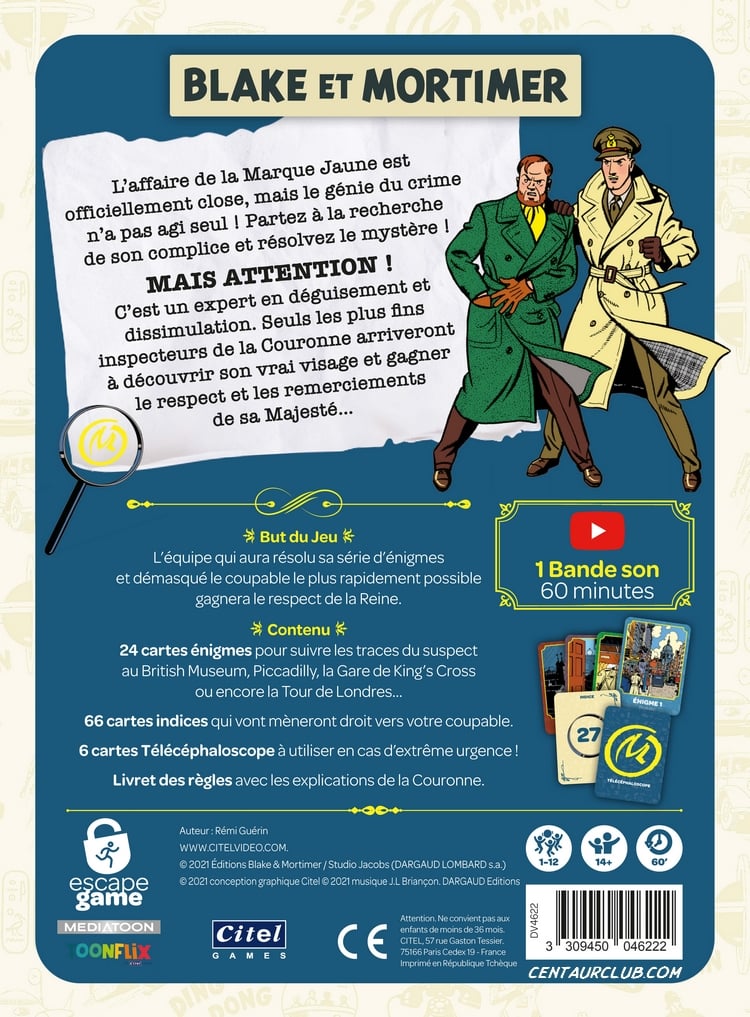 Ce nouveau jeu donc -édité par Citel et Kana- sortira le 28 septembre 2021 dans une Box contenant 96 cartes, propose aux joueurs de démasquer le complice du terrible colonel Olrik. Accompagné d’une bande son (via un service de streaming), les fans pourront jouer seul ou jusqu’à 12 joueurs sur ce jeu de type "like-Cluedo".