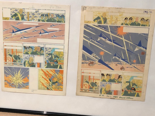 Également dans l’exposition une planche originale et deux bleus de coloriage dont celui exceptionnel de la version publiée dans le journal de Tintin et qui diffère de la version publiée en album.