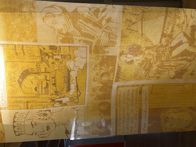 A l’époque, quasi aucune femme dans les bandes dessinées, et au jour d’aujourd’hui cela paraît inconcevable, aussi les commissaires ont-ils imaginé d’ajouter un drapé jaune transversal et sur lequel sont imprimés des personnages féminins de l’univers de Jacobs, dont la seule tête féminine retournée dans la première histoire avec l’Espadon.