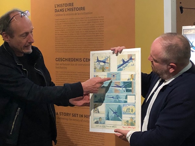 Juste après l’inauguration de la fresque de Blake & Mortimer, la presse était invitée à visiter en avant-première l’exposition présentée au Centre belge de la bande dessinée (CBBD). Nous avons donc eu droit à une visite commentée par les deux commissaires de l’exposition, Eric Dubois et Daniel Couvreur.