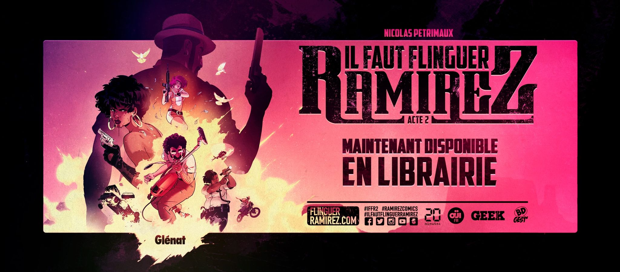Depuis 3 ans, j’entends souvent ce refrain « Mais pourquoi tu fais ça, c’est le taff de l’éditeur… » et ma réponse est simple : Oui, c’est vrai en parti, mais j’ai ENVIE d’être avec mon éditeur pour parler de mon bouquin, de ma création. J’ai envie que le petit message à la con qui figurera sur la PLV soit le miens, et qu’il soit maquetté à ma manière pour que les lecteurices decident de passer en caisse avec le bouquin (ou non) sans se tromper sur la marchandise. Accompagner la série de cette façon me demande beaucoup d’énergie, et me prend du temps. Du temps que je ne passe pas à travailler sur l’album en lui même. Mais cela fait partie de l’univers que j’essaye de bâtir. Un acte d’Il faut flinguer Ramirez, ce n’est pas simplement des pages de bandes dessinées, c’est un ensemble de choses, et certaines sortent du cadre de l’album papier. Au final, j’ai l’impression que cet effort paye, car je lis des centaines de messages via le site officiel ( flinguerramirez.com ) de personnes qui ont aimé et apprécié cette façon de raconter / communiquer.