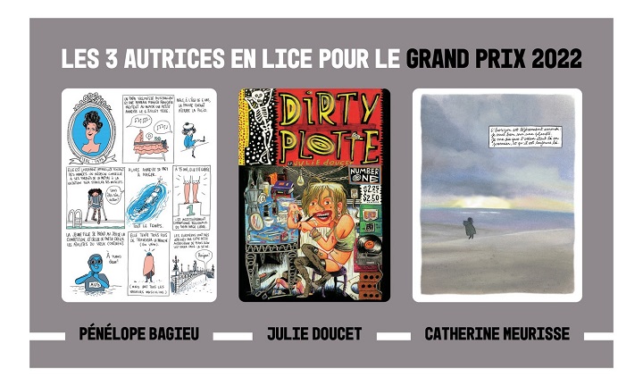 Parmi les trois autrices plébiscitées, c’est la première nomination pour Julie Doucet, tandis que Pénélope Bagieu est nominée pour la deuxième fois et Catherine Meurisse est finaliste pour la troisième année !