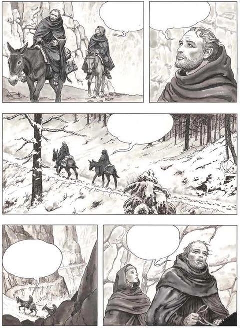 - Puis commence l'intrigue médiévale elle-même, et là Manara renoue avec le noir et blanc au lavis, rehaussé d'effets de matières et de modelés qu'il a déjà utilisé pour Le Caravage.