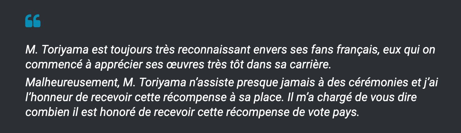 Si on peut se sentir vexé que l’auteur ne se déplace pas pour cette illustre récompense, rappelons-nous aussi que Toriyama-Senseï ne s’était pas déplacé non plus pour sa nomination au Eisner Awards…