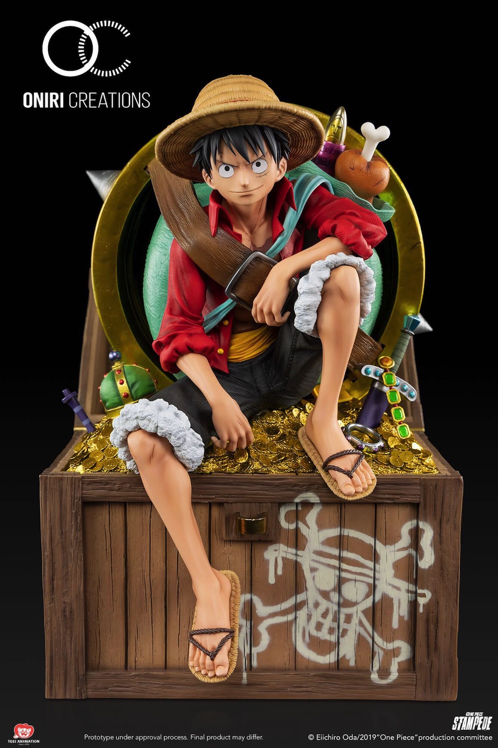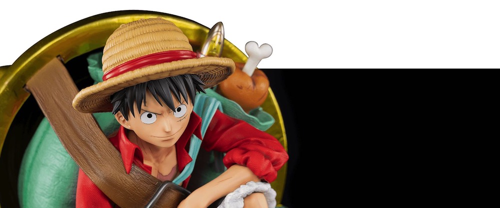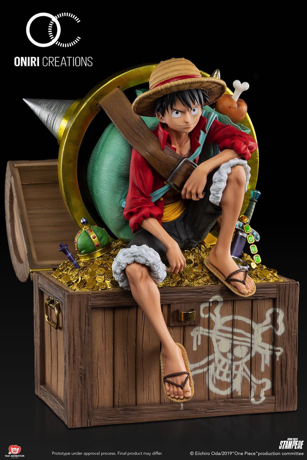 Réalisée à l’échelle 1/4, la figurine se présente comme une reproduction de la posture de Luffy sur l’affiche du film One Piece Stampede. La pièce offre différentes options de personnalisation avec 2 têtes interchangeables et 2 options de chapeau.