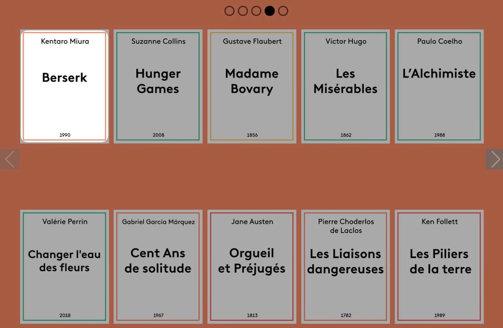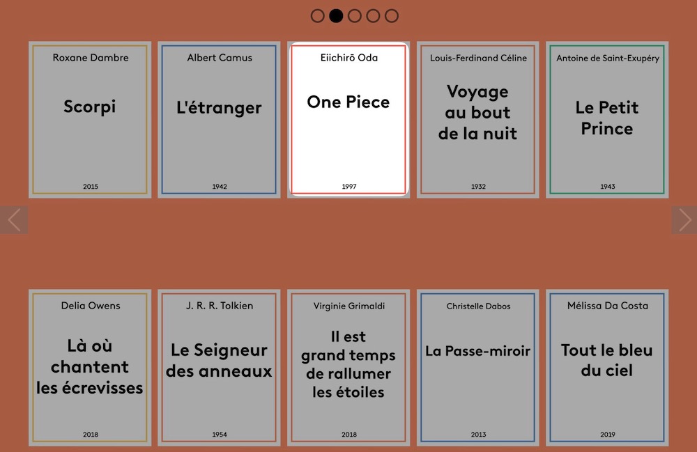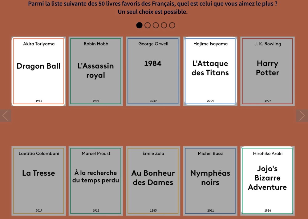 Pour découvrir les 50 livres, suivez ce lien (https://www.francetelevisions.fr/le-club/le-club-fans-de-culture/le-livre-favori-10139 ), puis cliquez sur les flèches à gauche et à droite. Pour voter, cliquez sur la couverture de votre livre favori.