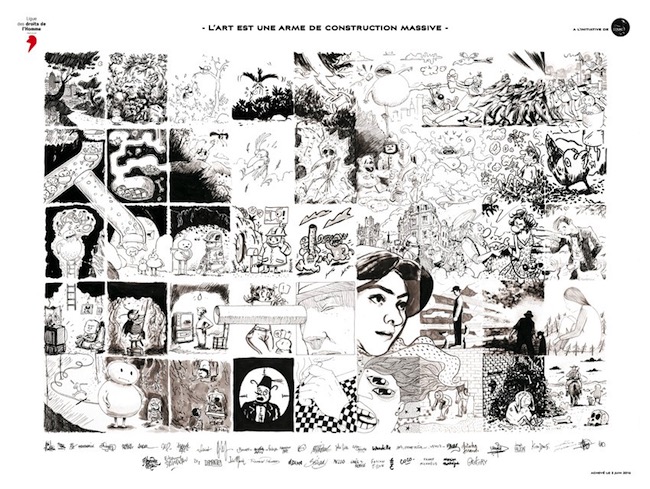 Quarante-cinq artistes de renom*, parmi lesquels Lewis Trondheim, Florence Cestac, Zep, Edika ou encore Coco, ont accepté de participer à ce projet de dessin unique. Une vidéo relatant le travail des dessinateurs, sur le texte Crache et une musique des Ogres de Barback et des Têtes raides, est disponible :