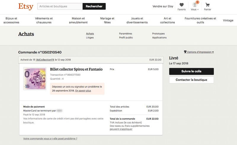 Pour terminer cet édito (et mon histoire), j’ai commandé 4 billets sur Etsy.com il y a moins d’une semaine, ai pu suivre le chemin de mon envoi « presque » en direct et l’ai reçu ce jour…