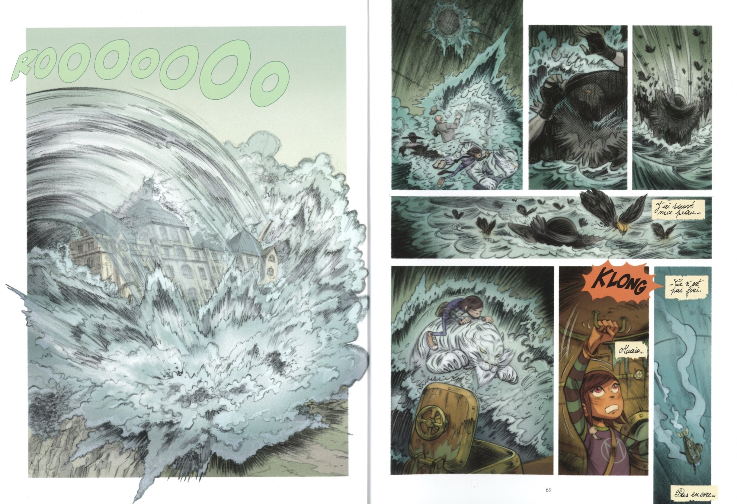 En parlant de pendule et de temps, ce second récit nous emmène donc 100 ans en arrière, à l’heure des premiers métropolitains et de la grande crue de 1910 qui inonda tout Paris et ses sous-sols. Et là aussi, on se surprend à contempler les représentations architecturales de cette époque ! Les planches de Johan Pilet fourmillent véritablement de détails graphiques de cette époque. Un mot encore sur la technique particulière du dessinateur : sur certaines planches, on a l’impression que son crayonné a survécu à l’encrage ; il utilise aussi beaucoup de tramage (toujours au crayon), ofrant un rendu visuel loin des canons usuels, mais très efficace ! Un pur bonheur pour les yeux !