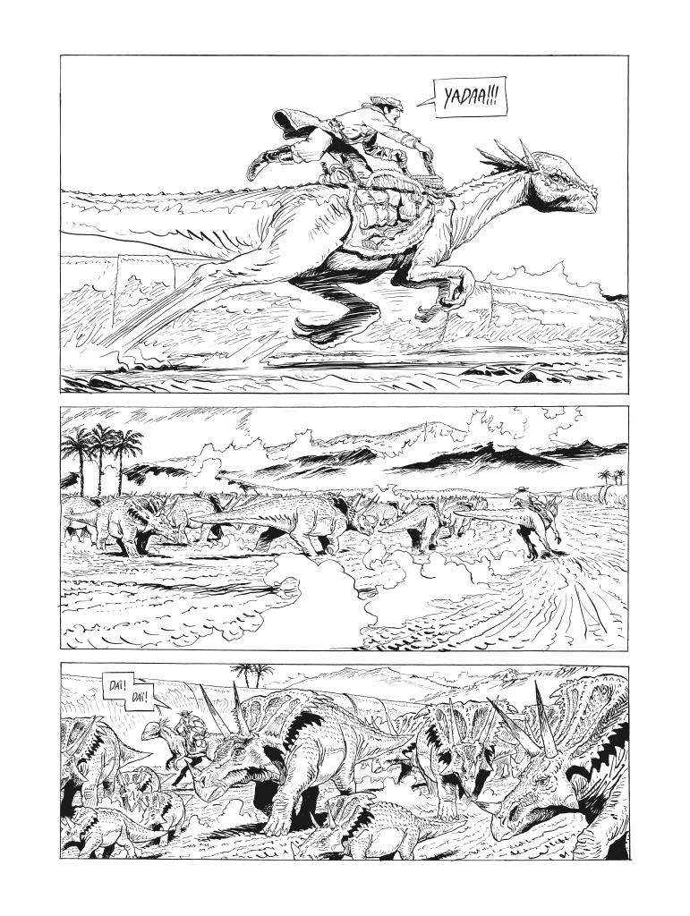 L’univers qu’il crée mêle science-fiction et aventure, nous y retrouvons un monde post apocalyptique peuplé essentiellement de déserts arides dans lesquels évolue notre berger conducteur de troupeaux de dinosaures ! Les villes flottantes sont parcourues de grands tuyaux énormes, des vestiges de la civilisation passée traînent dans les zones hors ville. La maîtrise de l’eau et du réseau d’aqueducs sont l’apanage de la Ville haute et les autres doivent survivre. Références et mélange de l’univers de Jeremiah, Mad Max, avec des dinosaures et l’esprit de Moebius malgré le western plutôt façon Giraud ?