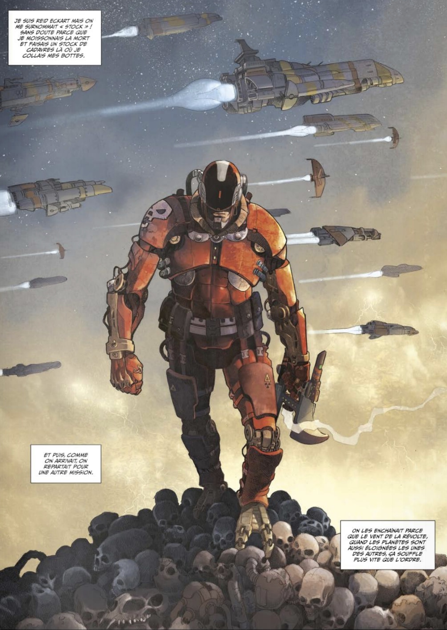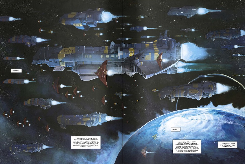 Les planches proposées par Erwan Seure-le Bihan sont donc magnifiques, emplies d’une noirceur crasse et calibrées avec le langage du héros ! La double-page d’entrée montrant l’armada de la Fédération est magnifique aussi…