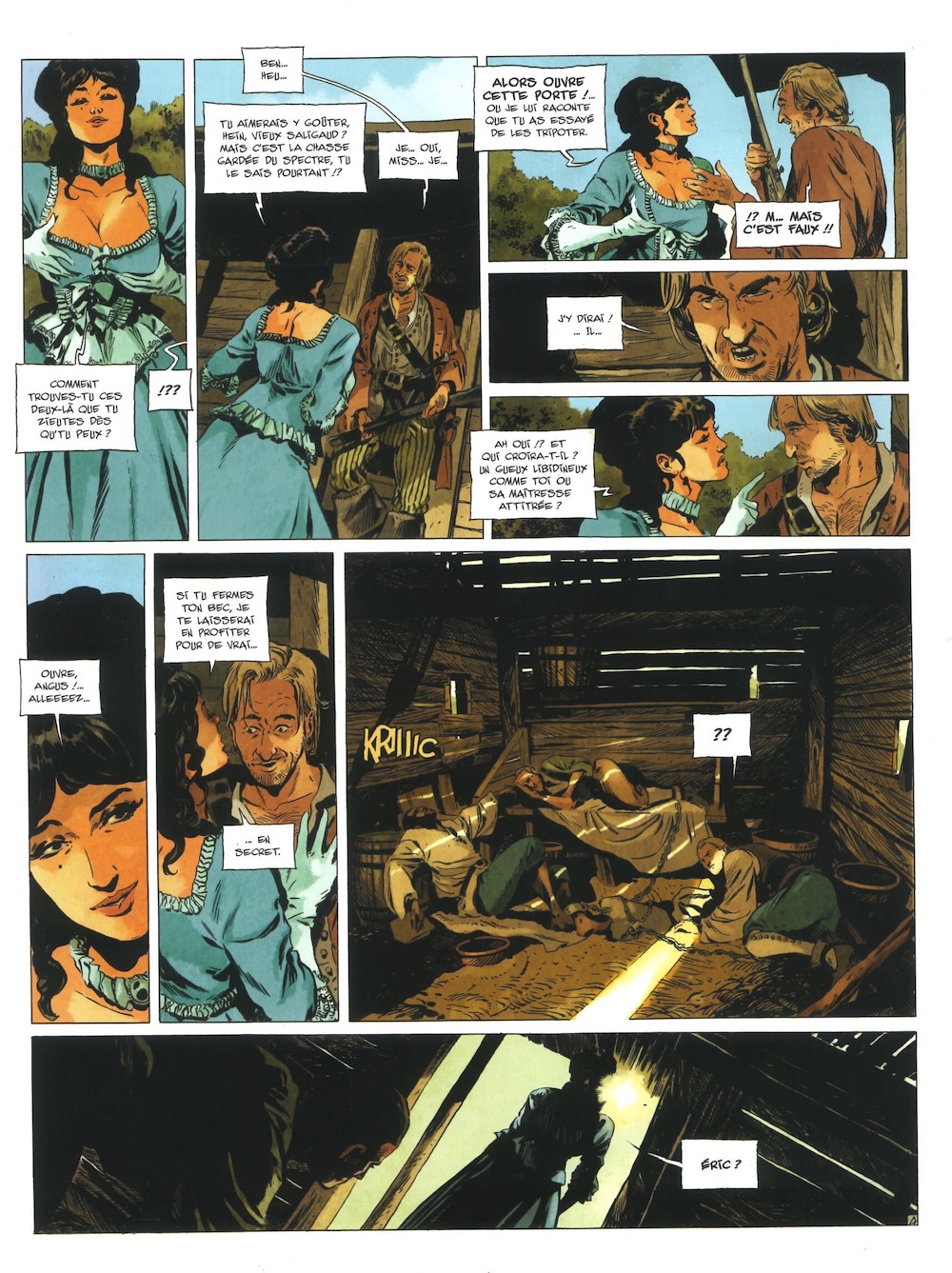Sur l’histoire, là aussi, on est bien servi : l’évasion astucieuse mais ô combien dure de Barbe-rouge avec son jeune moussaillon Rico nous rappelle bel et bien que notre héros barbu est avant tout un homme qui peut se montrer sans pitié aucune, quitte même à dévoyer un enfant innocent. Mais la surprise viendra assurément de Concha, ancienne amante démoniaque d’Eric le Rouge que Jean-Charles Kraehn a exhumé des albums originaux * et qu’il a pris malin plaisir a réintégré dans cette nouvelle histoire, au travers d’une approche totalement inédite pour ce personnage en révélant notamment ses failles et sa faiblesse.