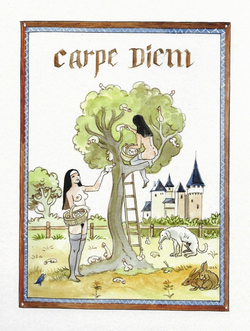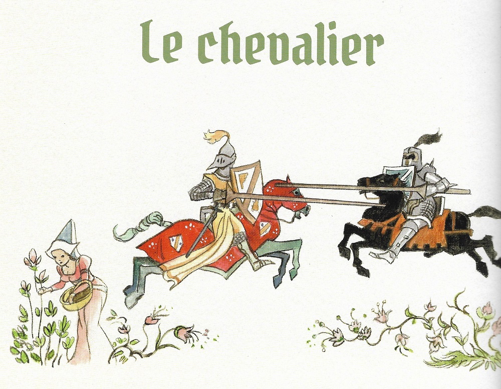 Mêlant habillement une trame générale autour des récits des différents pèlerins, Jean-François Charles nous offre petits textes (en vieux François), planches de bandes dessinées, et superbes compositions graphiques sur un ton léger, avec en fil conducteur un faune qui se balade dans chacune des 6 histoires contées par le laboureur, le chevalier, un peintre, un mercier, un collecteur d’impôt et une veuve surnommée l’empoisonneuse. Mais ces histoires au départ assez anodines deviennent grivoises, dans l’esprit des « Contes de Canterburry » de Chaucer ou du « Décaméron » de Boccace…