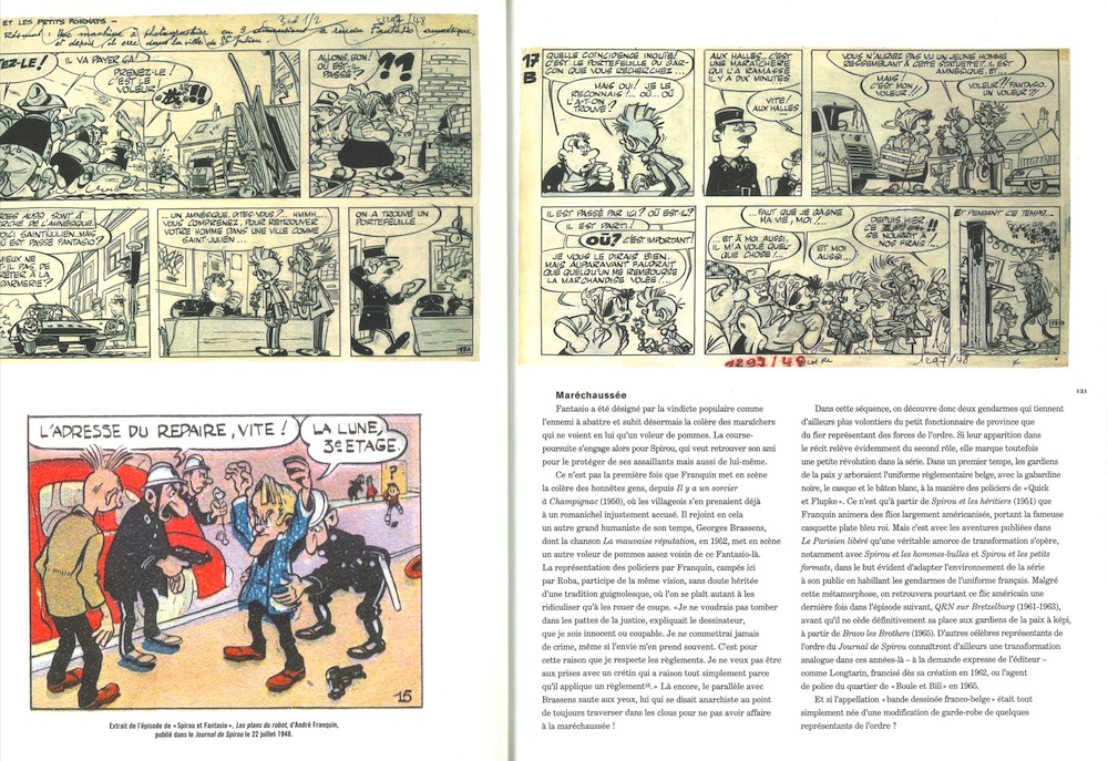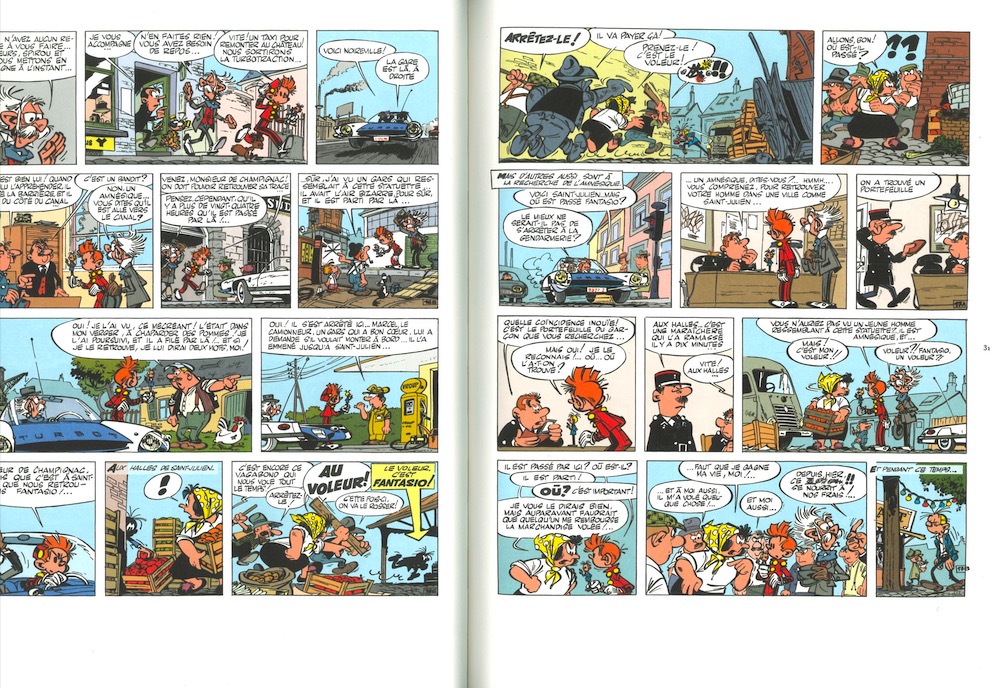 Si évidemment cette dernière attire en premier le regard grâce à un méticuleux travail de recolorisation des planches par Fred Janin (qui s’est basé sur les indications de l’époque de Franquin), on doit avouer que ce sont les planches issues du « Parisien libéré » qui nous ont le plus estomaqué ! On passe d’une planche à 4 bandes à une 6 bandes ! Fameux changement pour l’amateur car la dynamique de lecture est alors totalement différente et l’on voit enfin les fameux suspens de fin de pages tombés réellement au bon endroit !