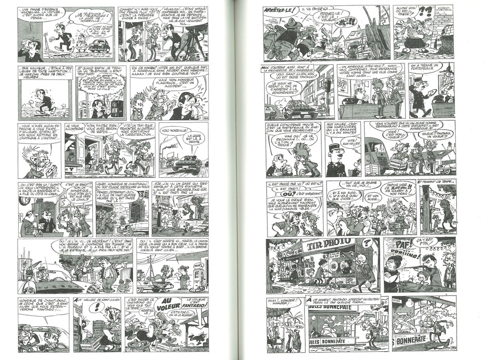 La générosité d'un collectionneur de l'œuvre de Franquin nous permet de vous proposer, ensuite, les planches telles qu'elles furent publiées dans Le Parisien libéré entre le 3 septembre 1960 et le 14 janvier 1961. C'est ici l'occasion de découvrir le découpage initial de cet épisode, dans sa version noir et blanc rehaussée de gris tramés, où chaque page de six strips est conçue comme un tout.