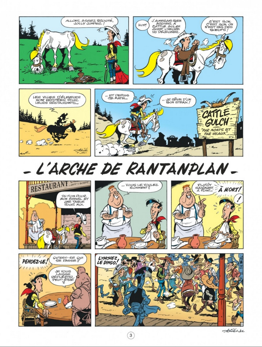Si ce n’est certes pas le meilleur album de Lucky Luke , je l’ai quand même trouvé sympa. La présence de Rantanplan, le chien le plus stupide à l’est comme à l’ouest du Pécos, en symbole de la protection animale y est certainement pour beaucoup, avec ses réflexions comme d’habitude complètement décalées. Et bien entendu, les scenes de jalousie de Jolly Jumper