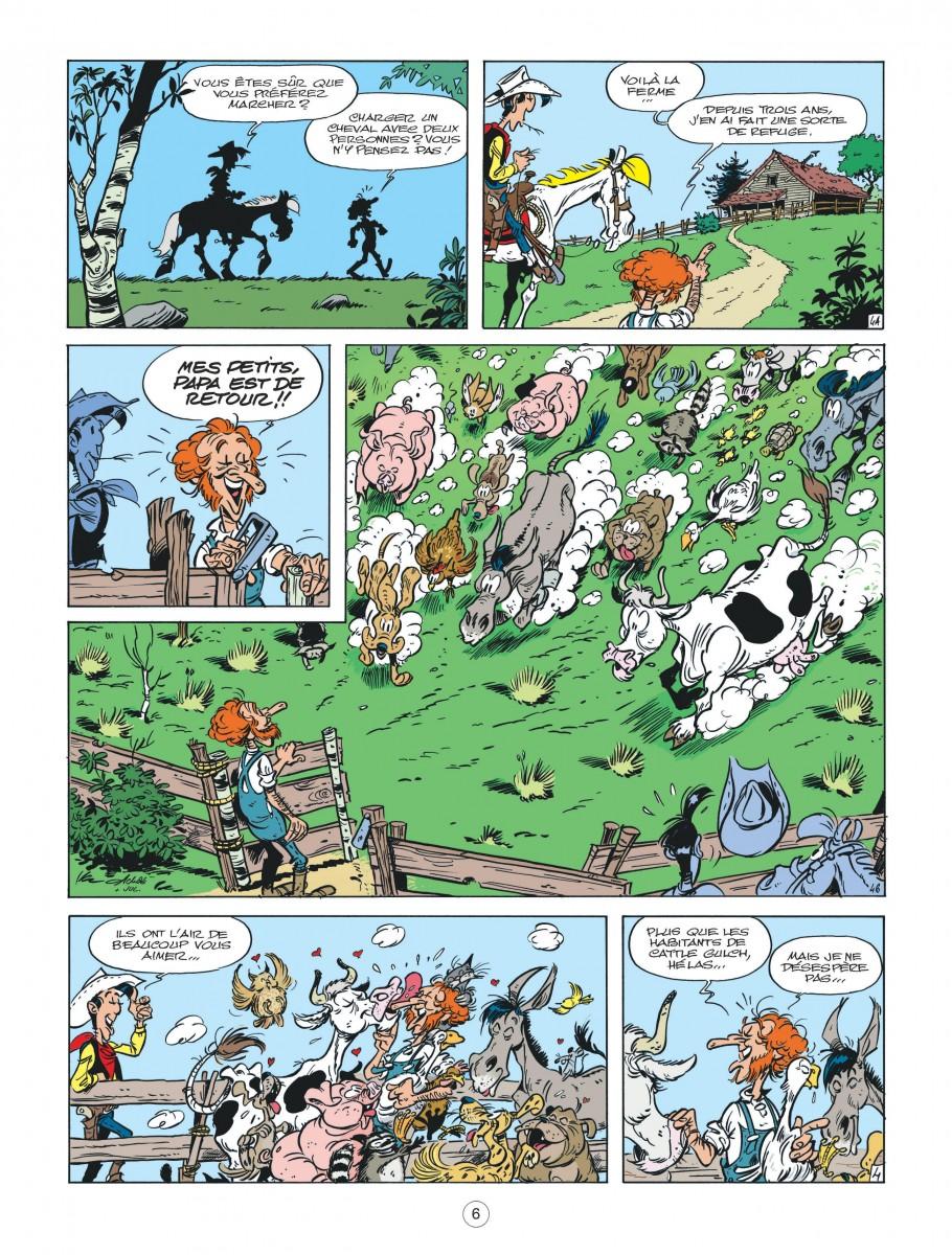 Afin d’assurer sa protection Lucky Luke le raccompagne chez lui , une ferme à l’écart de la ville transformée en refuge pour animaux . Quelle n’est pas sa surprise d’apercevoir au milieu des réfugiés , Rantanplan !