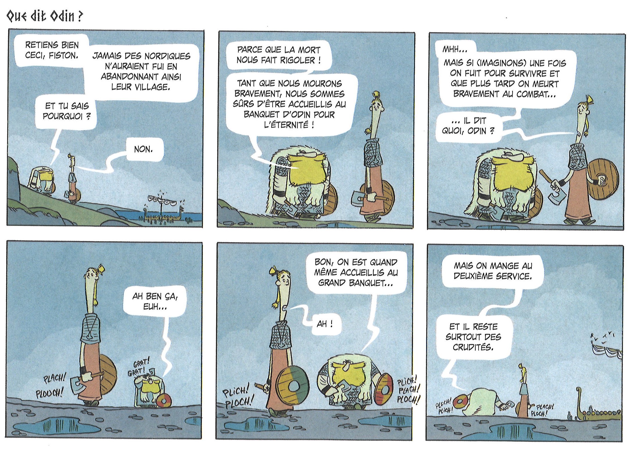 Avec l’humour qu’on lui connaît, Lupano (Les Vieux fourneaux) nous a concocté un bijou scénaristique avec des dialogues ciselés mais en y amenant aussi des réflexions de société sur notamment la religion catholique, des vikings et des musulmans. Comment se déroule la confrontation de ces différentes religions ? Banquets de Odin chez les vikings, résurrection catholique, repas des mille vierges chez les musulmans. Et on poursuit aussi l’apprentissage de la relation père-fils dans les groupes de prises de parole, le métier de boulanger, les combats, l’examen ou encore le duel au sommet entre le meilleur homme de chaque camp.