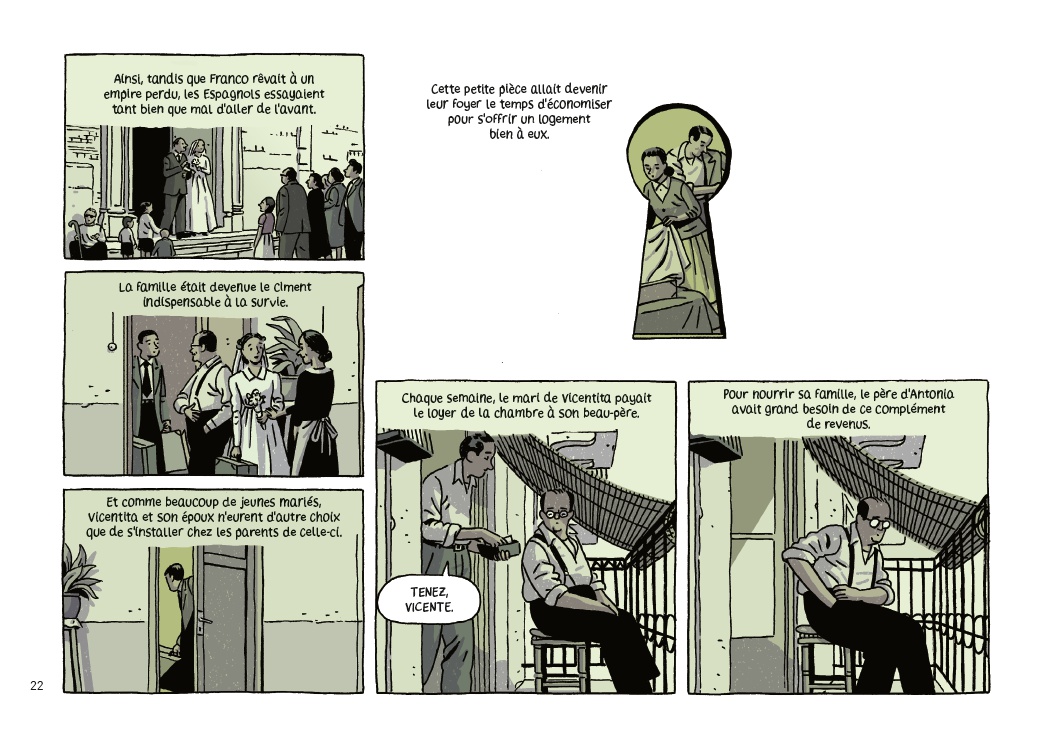 Paco Roca nous replonge aussi dans cette période compliquée de l’Espagne où les conditions de vie étaient misérables. Le luxe était de recevoir une tasse de café qu’on parvenait à échanger contre de vieux tissus en discutant âprement et avec l’espoir de pouvoir disposer d’une tasse pour tout le monde. Les loisirs consistaient à descendre la table et à manger dehors dans la rue ou à prendre les transports en commun pour se rendre sur la plage… La place de la religion dans ses dogmes austères y est également prépondérante…
