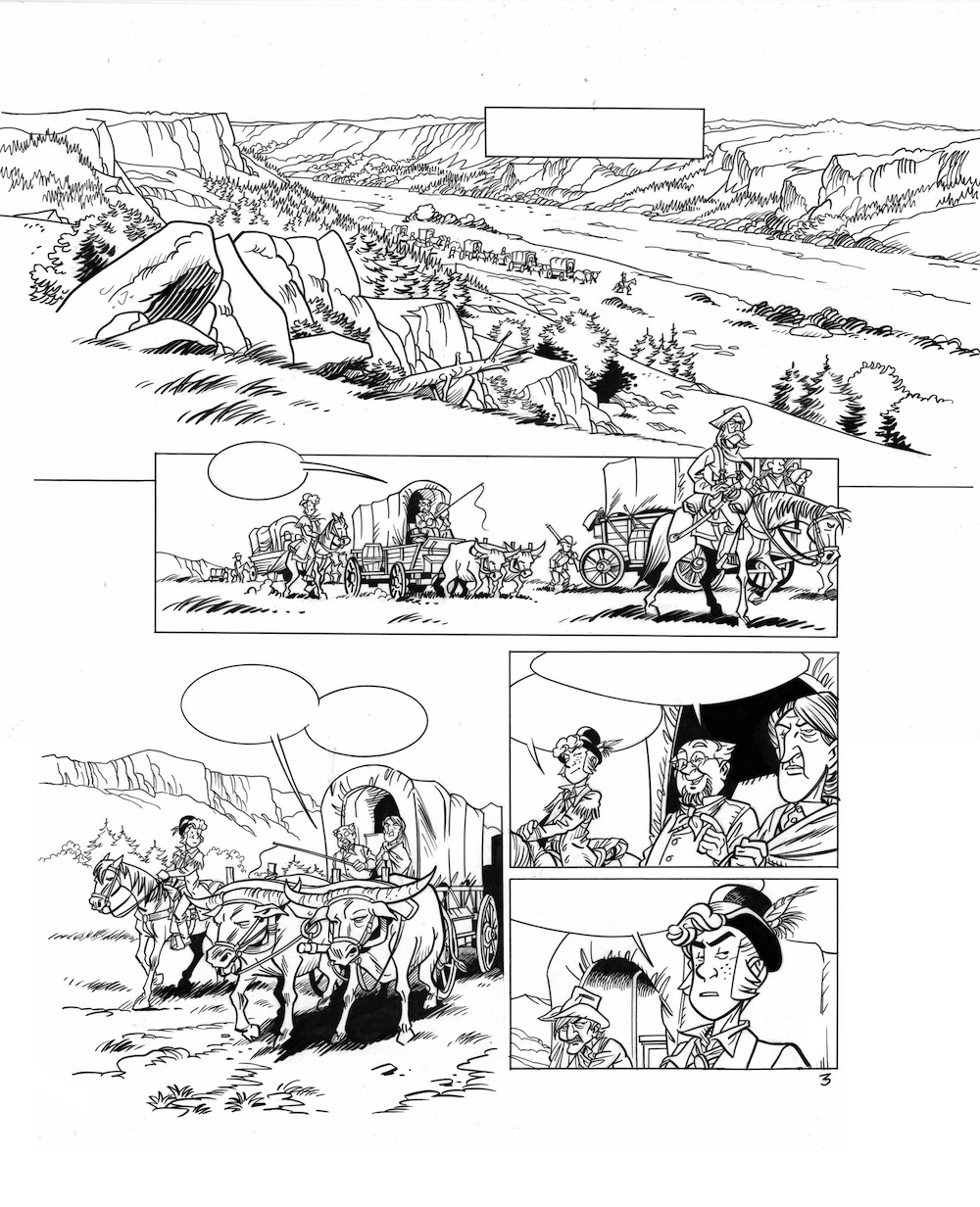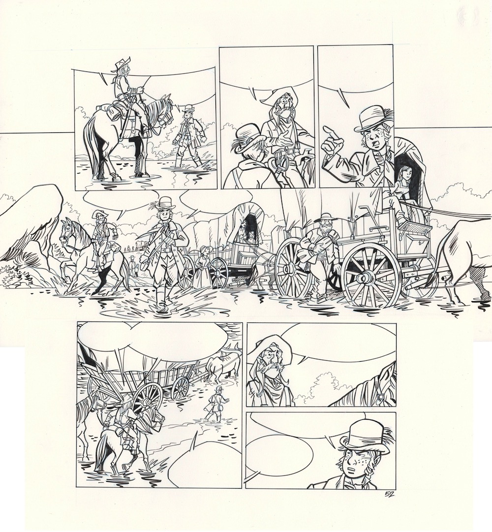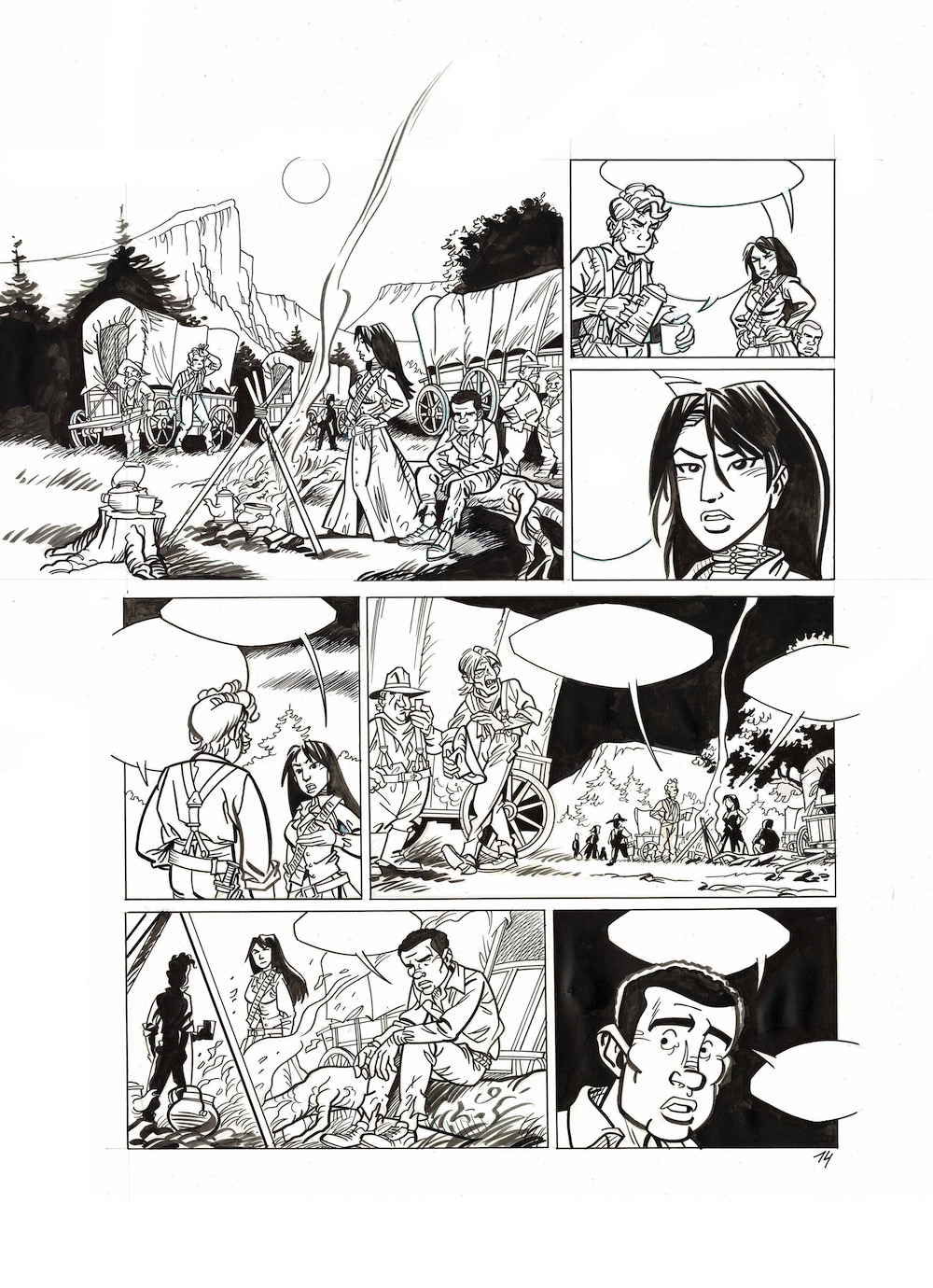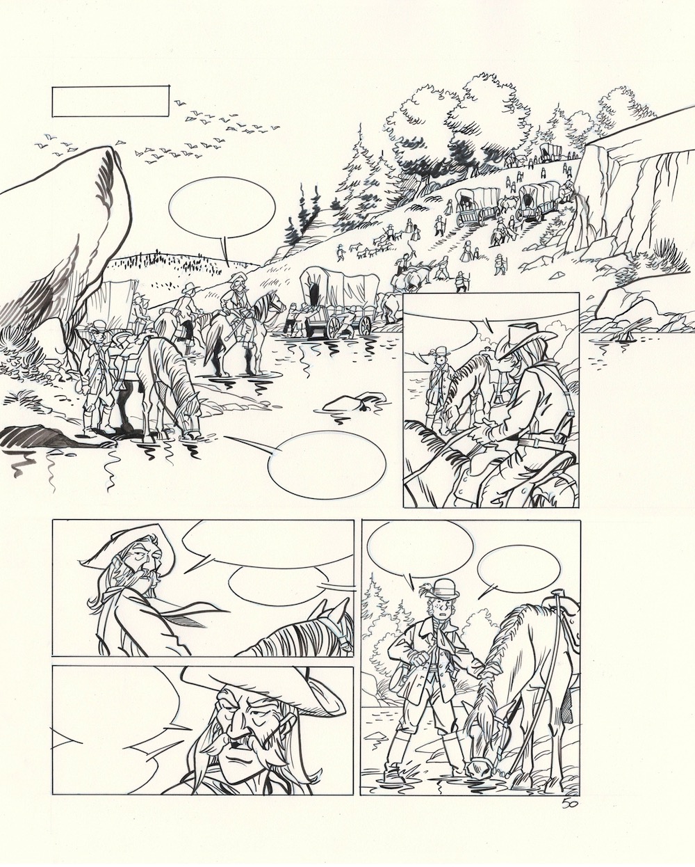 Jean-Marc Krings lui, s’il n’est pas l’auteur « d’une série » nous a déjà gratifié de très belles reprises : Fanny K, Violine, la ribambelle…. Son graphisme suit un courant semi-réaliste franco-belge, mais est directement reconnaissable. Très efficace , notamment dans les expressions de ses personnages, il s’avère sur cet ouvrage totalement en phase avec le récit et les vastes paysages amérindiens.