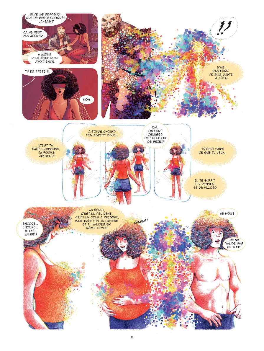 Véro Cazo la scénariste (Olive, Le Bal des folles,…) nous offre une belle histoire originale avec de l’émotion, du texte, des ambiances… et nous montre une VR (réalité virtuelle) empreinte de poésie. Souvent la VR nous projette plutôt dans des mondes parallèles avec de la violence, des combats, des jeux où l’on incarne un héros… Mais rien de tout cela ici, c’est une réalité virtuelle positive, optimiste, voire un brin utopique. Cela m’a fait penser parfois au bouquin d’Alexandre Jardin « L’île des gauchers ».