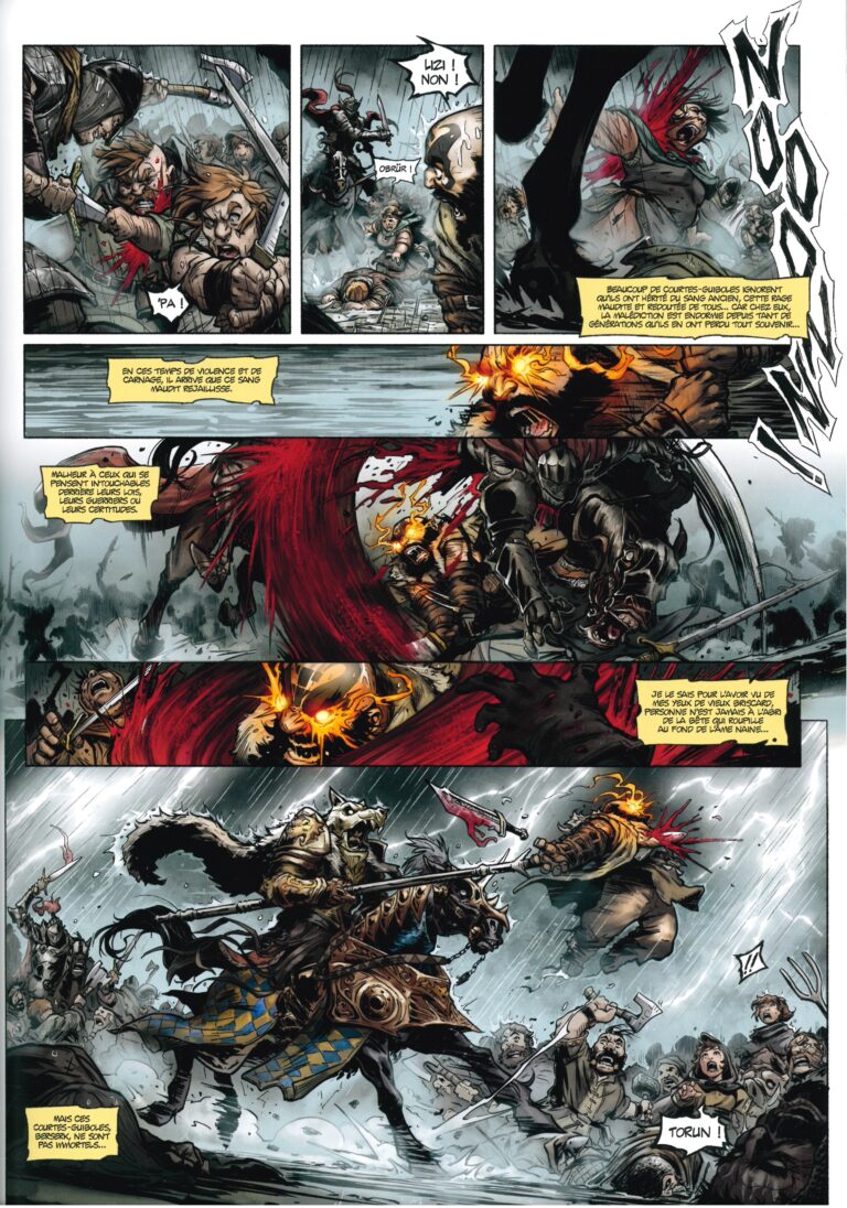 Beaucoup d’auteurs crédités sur cet album, probablement pour aider à pouvoir tenir le rythme de sortie de près de 3 albums par an ! Nicolas Jarry aidé de David Courtois pour la partie scénaristique, tandis que l’on retrouve Alex Sierra et Livia Pastore au dessin. Ils nous offrent des scènes de bataille flamboyantes et leurs cases fourmillent de détails.