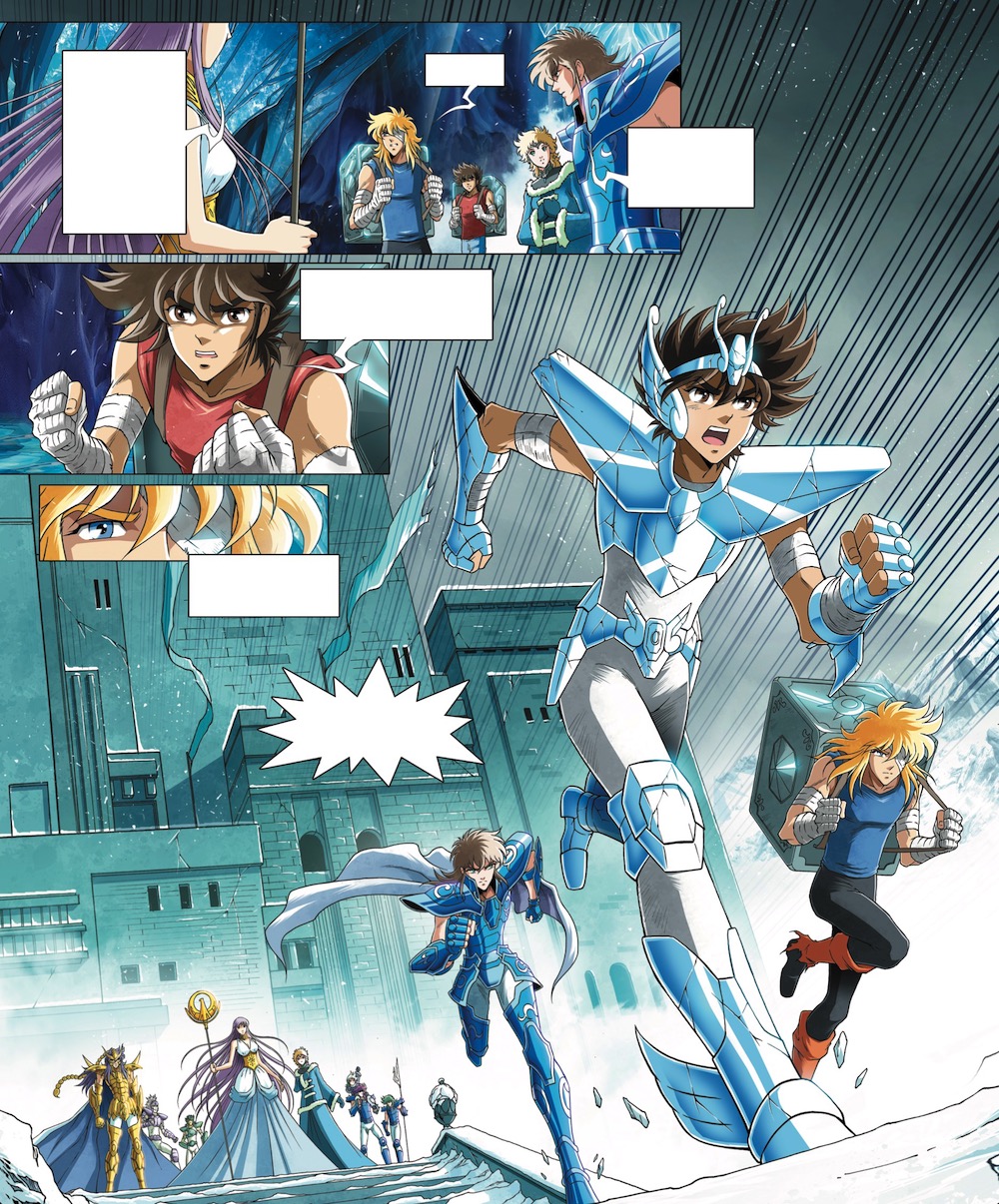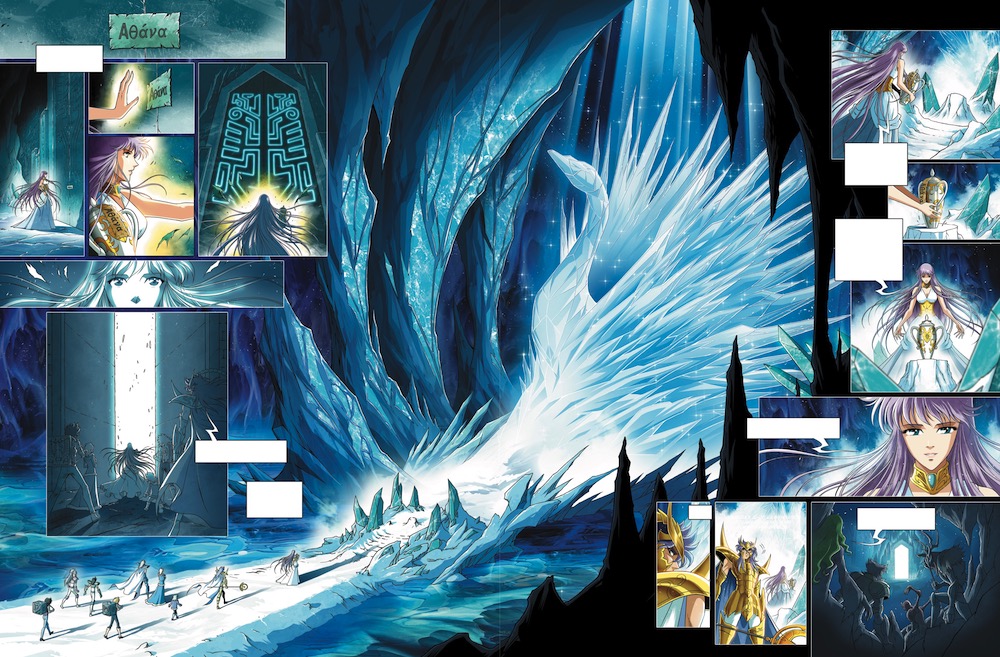 - Une autre pirouette de notre duo d’auteurs, qui permet de relier leur histoire au Lore de Saint Seiya et que cette fameuse grotte recueille en son sein le feu sacré, mais aussi l’urne, où se trouve enfermé l’âme du dieu Poséidon.Tout naturellement alors, nos deux scénaristes situent leur histoire inédite, juste après l’arc Poséidon, quand Hyôga (devenu chevalier d’or) ramène à Blue Graad l’âme de Poséidon dans la grotte.