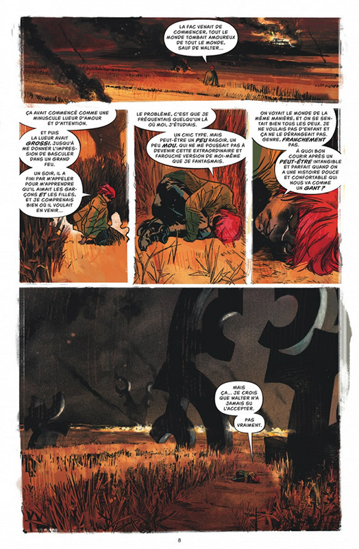Martinez Alvaro, s’est, pour sa part, lancé un défi de taille qu’il manqua de regretter : réaliser son encrage et passer au numérique. De son propre aveu, il a cru qu’il n’y arriverait pas et ce n’est que quand il envoya ses premières planches que son entourage le rassura sur la qualité de celles-ci. C’est un passage au dessin numérique en force et amplement osé, mais qui donne le résultat que l’on a sous les yeux : SPLENDIDE ! Pour ma part je suis très fan de son style, plutôt aérien avec cette touche néo-rétro qui va parfaitement avec l’histoire. Je suis resté bluffé par les pleines pages entre chaque chapitre, traitées comme des photos prises au flash dans le noir complet, quelle maitrise des ombres et des lumières ! Du grand art !