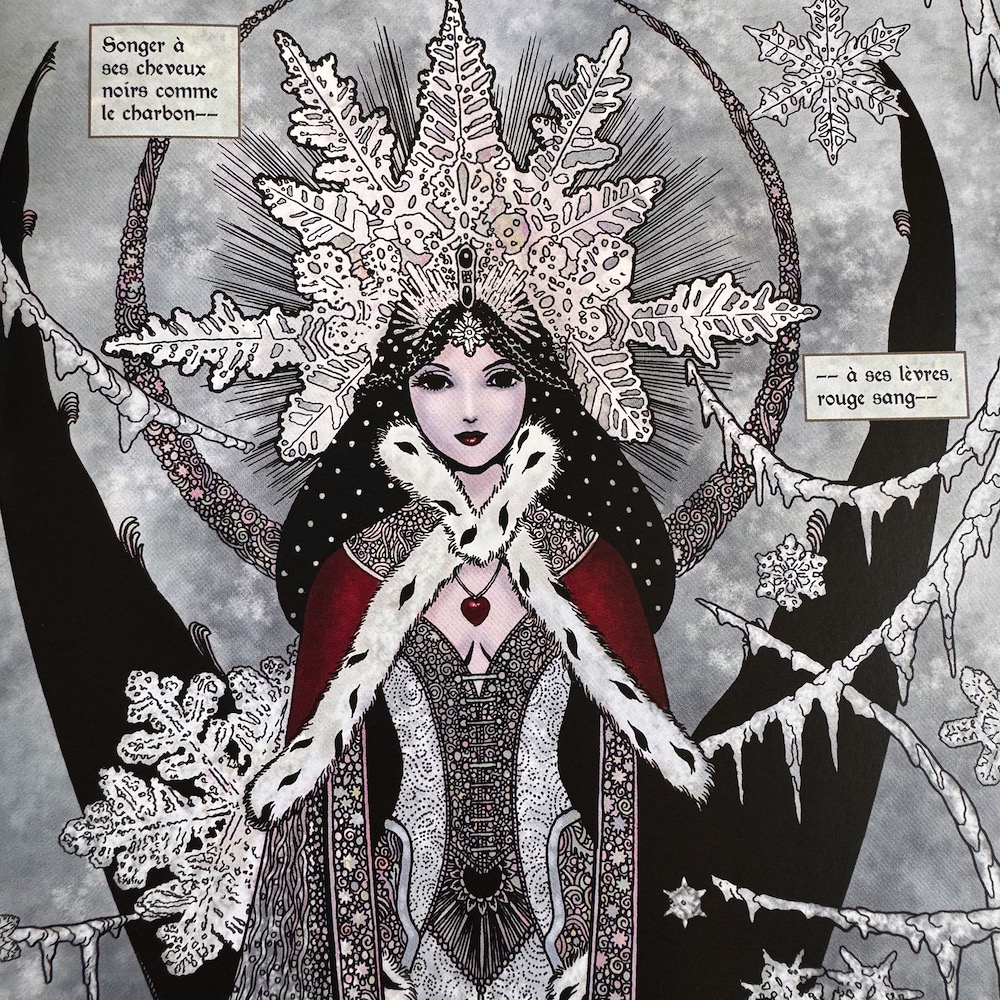 Publiée pour la première fois en 1994 sous la forme d'une nouvelle en proses, puis rassemblée dans son anthologie « Smoke & Mirrors, Blanche-Neige, Rouge Sang, chronique vampirique » (« Snow, Glass, Apples » en VO) embrasse la noirceur de la rivalité originelle entre une princesse et sa marâtre, et donne une raison monstrueuse à la pâleur de la peau et aux lèvres rouge sang de Blanche-Neige.