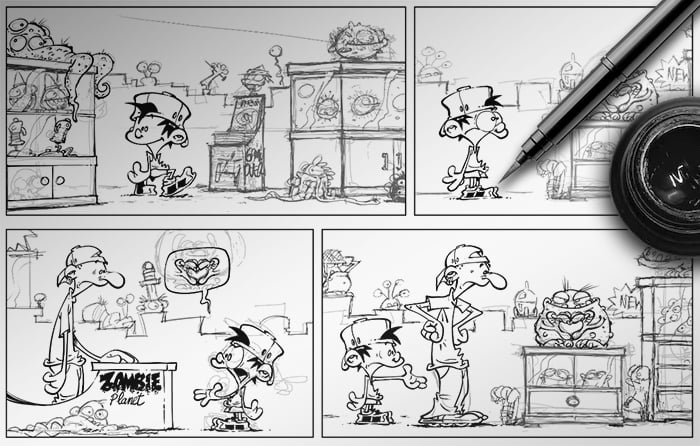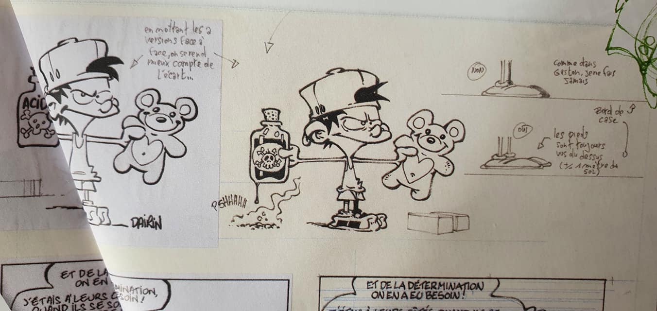Midam : J’ai en effet accepté de déléguer, avec difficulté, et je dois donc être tolérant. Le projet est de pouvoir mettre en satellite la série, en pilotage automatique, tout en restant exigeant. Je donne donc une série de cours de dessins, de corrections, d’intervention sur les scénarios… Je supervise donc le dessin et les scénarios quand ils ne viennent pas de moi.