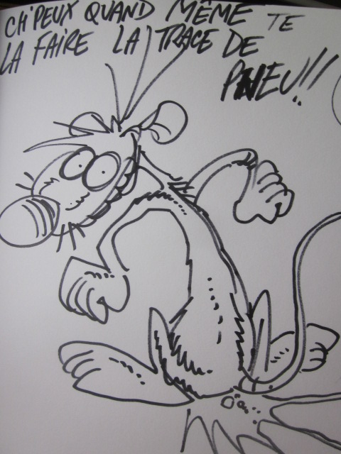 Je vais souvent en Afrique. J’y ai vu des choses qui m’ont servi à créer une BD réaliste qui je publie sur le net, faute de trouver un éditeur. C’est un reportage trash sur les OMG en Afrique publié sur le net. Au sein de la même OMG il y a une compétition pour s’adjuger les subventions, les marchés à décrocher. Il y a une sorte de prospection commerciale pour que leur truc tourne. A la base c’est bon mais tout se perverti avec les années, par le pouvoir et tout ce qui gravite autour. Les rats sont quand même des humains, cela me permet de me distancier. Je suis passé chez Fluide parce que le dernier Pacush Blues qui parlait de la maladie et de la mort n’a pas marché chez Vents d’ Ouest. J’ai tenté autre chose… fait un projet avec Malka… Mes rats font la guerre depuis longtemps, ils utilisent le gaz, un truc où il faut bouffer plein de fayots. Ce sont les Pirat’s, les mêmes que dans Rat’s mais pas que dans Pacush Blues. Il y a des personnages récurrents, ils s’en prennent à des mulots, une race qui vit sous terre. Le rat n’a pas la même conception de la guerre, ce sont des teigneux, ils conquièrent, éliminent et prennent la place, gardent des femelles et créent des souches. Les rats font des colonies. Il y a autant de rats sur la terre que des humains, le rat va survivre car il a vécu sur des îles où il y a eu des expériences atomiques. Du coup, si il y a un cataclysme, ce sera au tour des rats, ce sera la planète des rats. J’ai eu des rats quand j’étais ado, comme cela j’ai pu les observer et m’en inspirer. Plus tard, pendant une dédicace en Suisse on m’a offert un couple mais c’étaient deux mâles qui ont vécu quatre ans sur ma terrasse. Ils étaient parfaitement apprivoisés ! Au Mozambique j’ai pu rencontrer un belge qui élève des rats qui repèrent des mines. Les rats ont démarré en 76 (dans un zine édité par J-C de la Royère) et le premier album est sorti en 1983, mais cela n’a réellement démarré qu’au sixième album. Un tirage à 30.000 chez Vents d’ouest. Cela ne paraissait jamais dans des journaux, mais j’ai fait trois bouquins avec des cochons qui ont été publiés. Il y a dés lors un autre rythme pour dessiner, il faut faire une histoire par mois mais comme je veux continuer à voyager je prends le risque d’écrire la moitié de ma BD avant de signer le contrat. Le problème c’est qu’avec les rachats, les éditeurs changent, les tendances et ça n’aboutit pas...