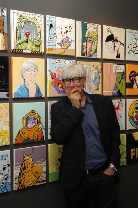 Bien qu’ayant le look d’Andy Warhol – Andy Waarom comme il l’apelle - Johan Willy De Moor est un fils de BD. Il est tombé dedans quand il était petit, avec son père Bob de Moor et son parrain Willy Vandersteen. Doué, il a faillit reprendre l’Alph’Art mais il s’est fait Quick et Flupke. Puis il emmêle Breughel dans sa ligne claire et crée Gaspard de la Nuit, devient plus caricatural avec la Vache… Il est aussi dessinateur de presse et son humour est corrosif.