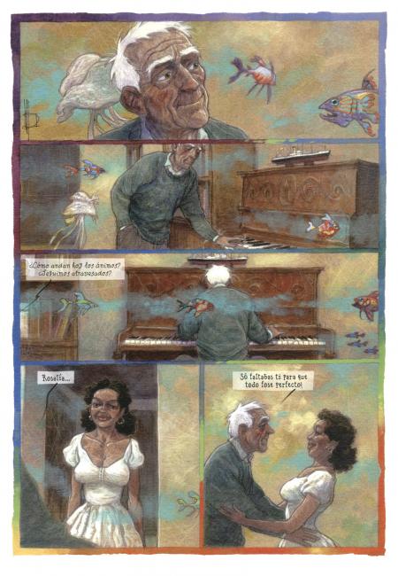 Fidel même est un gardien de la porte de sa maison qui est une frontière ; le jour c’est une maison réelle et quand il reste tout seul, il va de ‘l’autre côté’. Les éléments visuels comme les poissons qui passent sont des codes pour le lecteur pour faire savoir qu’il bascule dans un autre univers, celui bercé par ses lectures d’enfance mêlé aux souvenirs d’autres... Il a plus de souvenirs qu’il n’est capable de gérer. Fidel a quelqu’un qui l’écoute (Sabela) et il est persuadé de raconter la vérité.