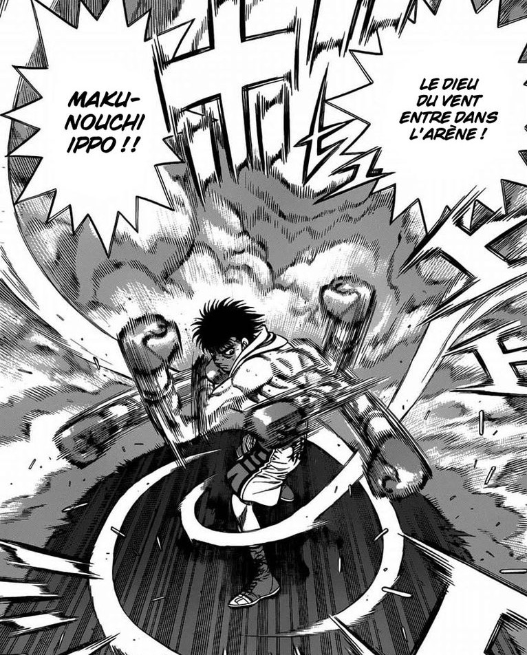 Alors qu’il est sur le point de monter sur le ring pour affronter Hisato Kojima, issu de 2 catégories au-dessus de lui, Ippo demande conseil auprès de Takamura. En effet, il craint ne pas pouvoir encaisser les coups de son terrible adversaire. La réponse de double champion poids lourd sera à la hauteur du personnage : tout en finesse ! On vous laisse découvrir…Hisato de son côté suit un entrainement atypique pour un boxeur : afin de rester dans la même catégorie que notre héros, il passe tout son temps d’entrainement à courir et au sauna ; il n’arrête pas de transpirer, afin que son corps s’assèche au maximum…