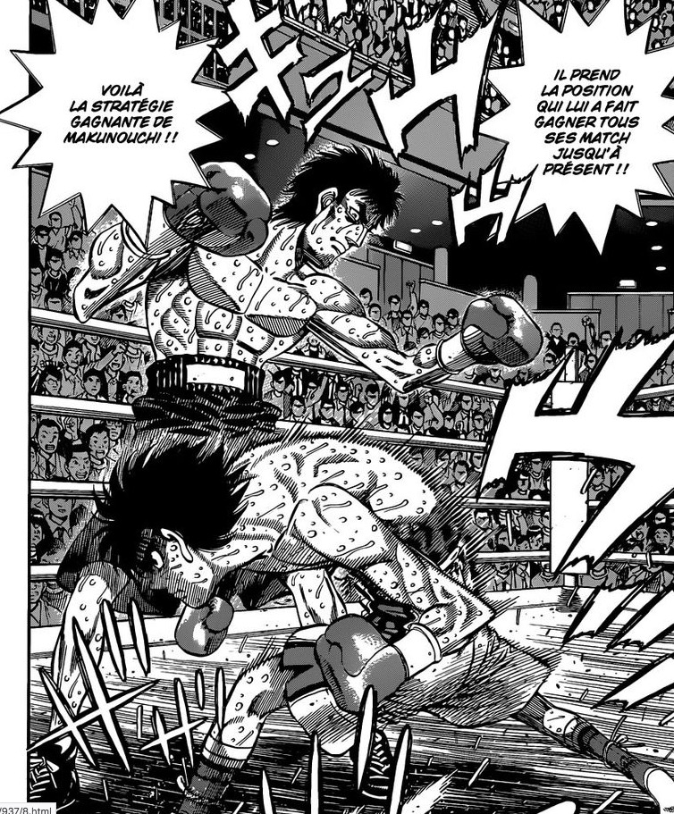 1’30" et toujours rien… La tension sur le ring et dans les gradins est palpable ! L’arbitre veut intervenir (on est sur un match à retentissement mondial !) mais ne sait quoi faire non plus… Ippo Makunouchi n’est pas dans son état normal, il n’adopte même pas sa garde habituelle ?! En face, son adversaire est comme tétanisé, pris entre sa joie d’être enfin confronté à son idole, prenant la mesure réelle de son aura, mais sur aussi de sa force et de son contre, qui mettra K.O ce champion du monde !