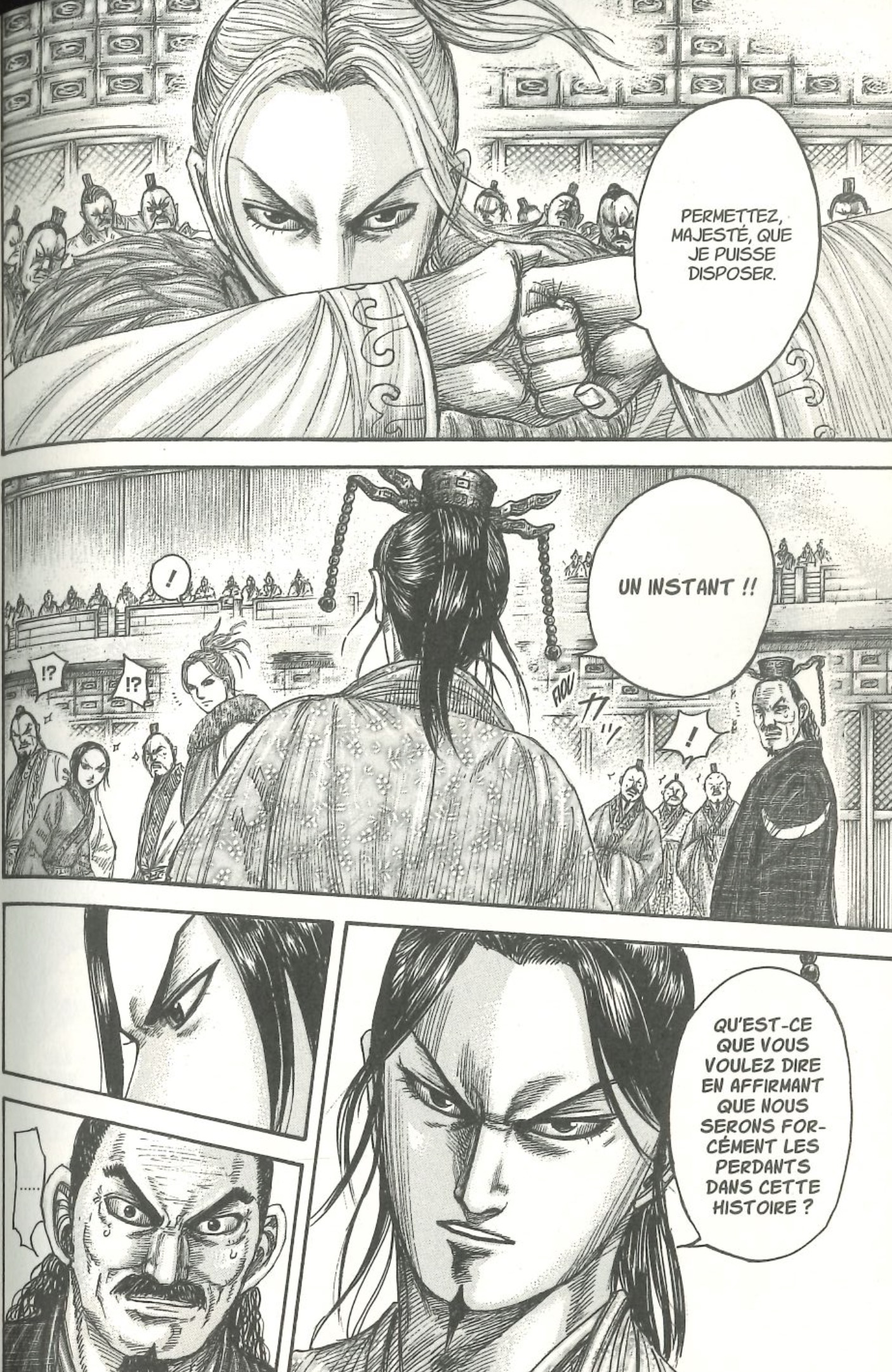 D’un côté, le sémillant Saitaku a organisé une rencontre secrète entre son monarque Ei Sei et Ouken, le 8ème Roi du royaume de Qi ; A cette rencontre inédite s’est adjointe une seconde rencontre, avec cette fois le plus terrible ennemi de Qin, Riboku…