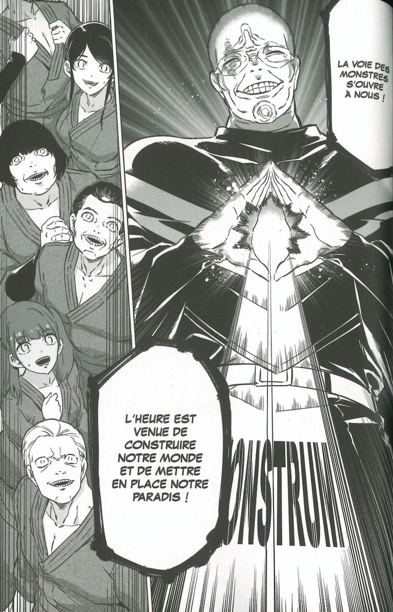 En face, l’ennemi tisse sa toile : le temple du Parti de l’Ultraréincarnation recrute à tours de bras de nouveaux adeptes parmi les reclus de la société. Ce qu’évidemment tous ces laissé pour compte ignorent, c’est qu’ils ne serviront que d’offrandes pour les rares d’entre eux qui réussiront leur transformation en monstre… « Manger ou être manger », voilà leur triste réalité cachée par Furano, grand maitre spirituel du Parti…