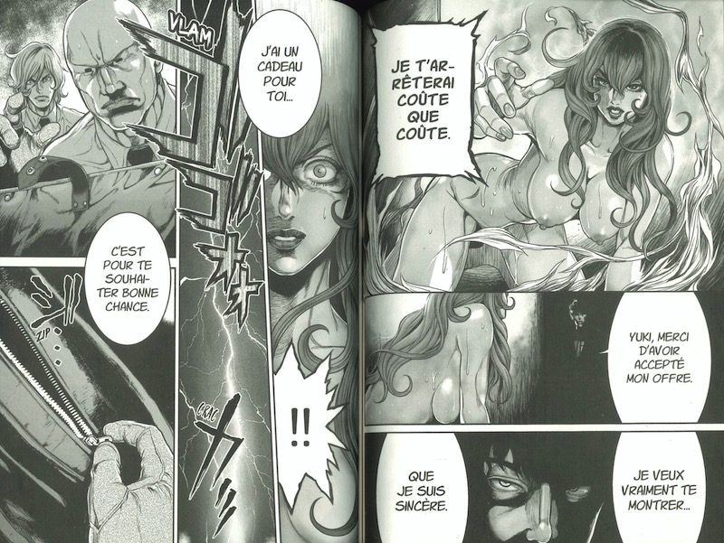 Le triple chapitre intitulé « La fleur karmique » est de loin le plus intéressant de tous ceux présenté jusqu’ici : pour une fois, Tabe Koji a réellement mis en danger son héroïne, lui octroyant même quelques cases où elle a pu nous dévoiler des bribes de son passé…. Bien trop peu certes pour amener réellement du fond à la série, mais on a bien compris que ce n’est pas l’effet recherché…. Le mangaka prend un pied d’enfer en réalisant l’équivalent de clips vidéos sur papier, où tout est magique : l’image, la mise en scène, le cadrage, le rythme…. Ca se lit vite, très vite. En ce sens, il a pleinement atteint son objectif !