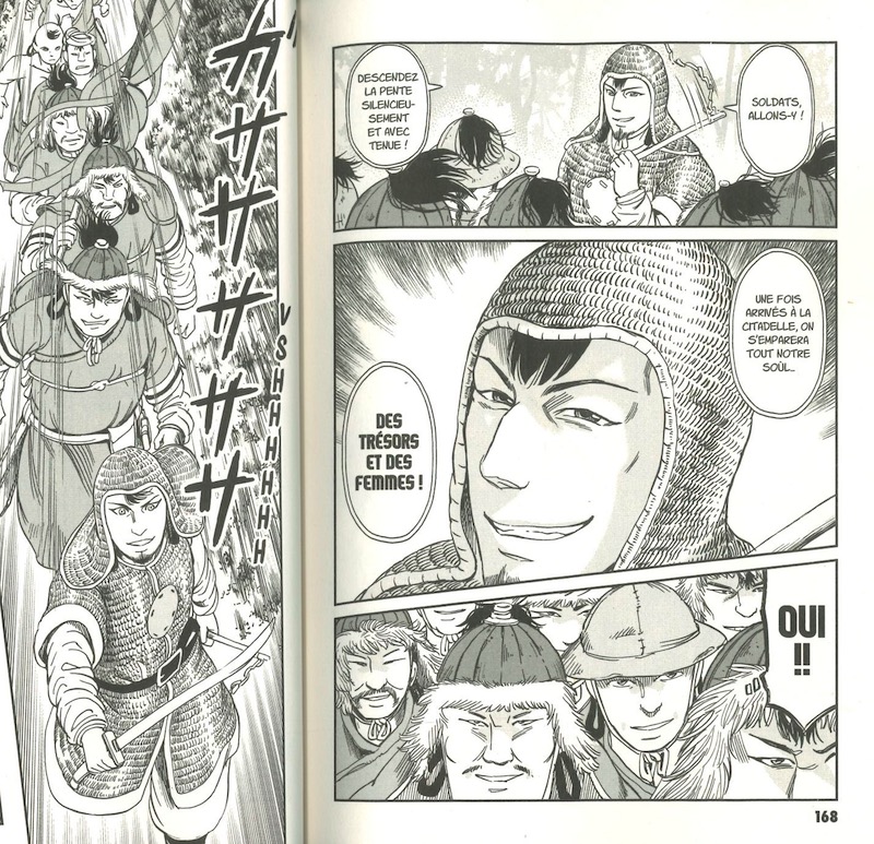 On perçoit bien dans les visages et dans les planches la peur des résistants : ils sont 160, face à un millier de mongols !