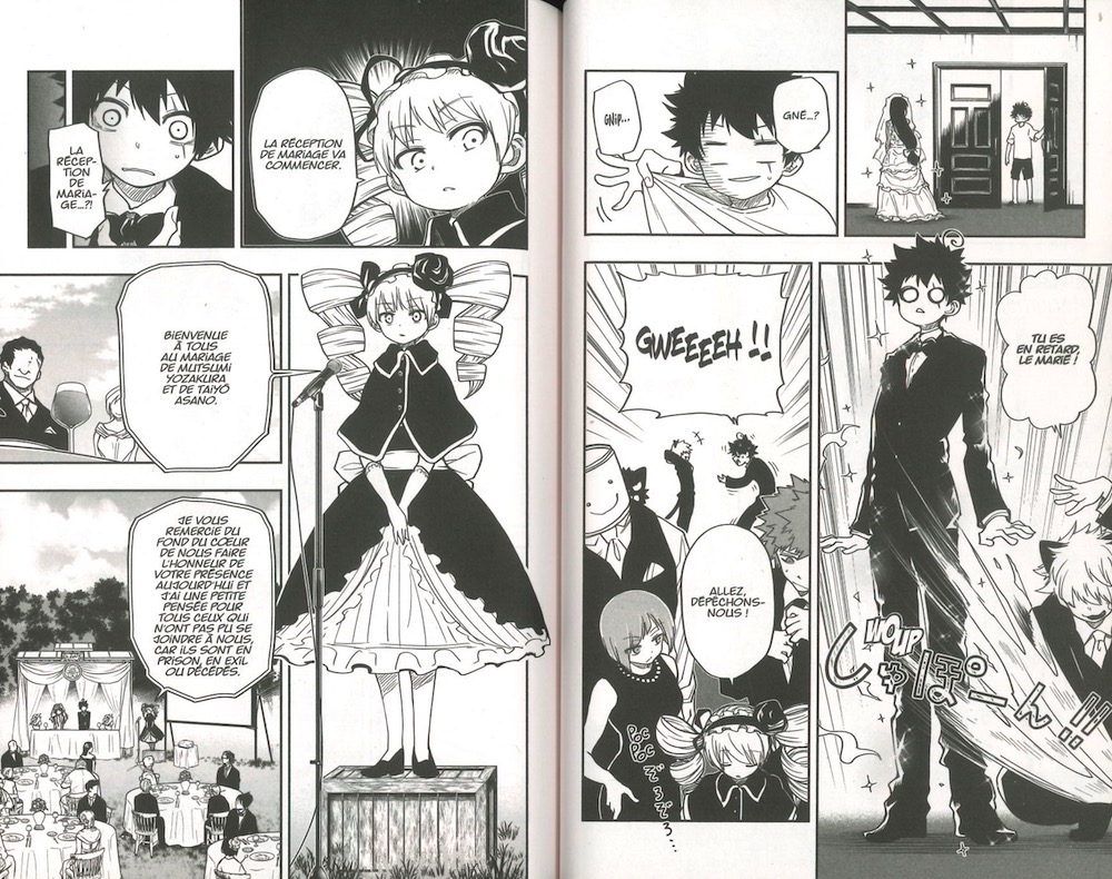 Dès l’entame du second chapitre de ce tome, notre « pauvre » héros Taiyô est entrainé dans une cérémonie de mariage (le sien !) totalement folle : comme il est de coutume de ce milieu, cette réunion des plus grandes « familles » est surtout l’occasion de présenter à tous le nouveau couple à la tête de la famille Yozakura… et de tester les compétences du futur marié !