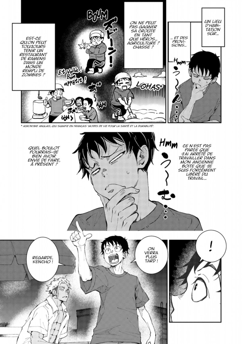Ce dernier continue de barrer des souhaits sur sa bucket list. Et quoi de mieux que pour se déplacer parmi une horde de morts-vivants qu’un superbe camping-car avec tout le confort nécessaire ? C’est en se rendant au showroom que les deux comparses rencontrent Shizuka pour la troisième fois. Celle qui, jusque-là, n’avait jamais accepté de les accompagner dans leur périple, changera bien vite d’avis lorsqu’elle se rendra compte qu’il lui sera difficile de quitter la ville sans leur aide.