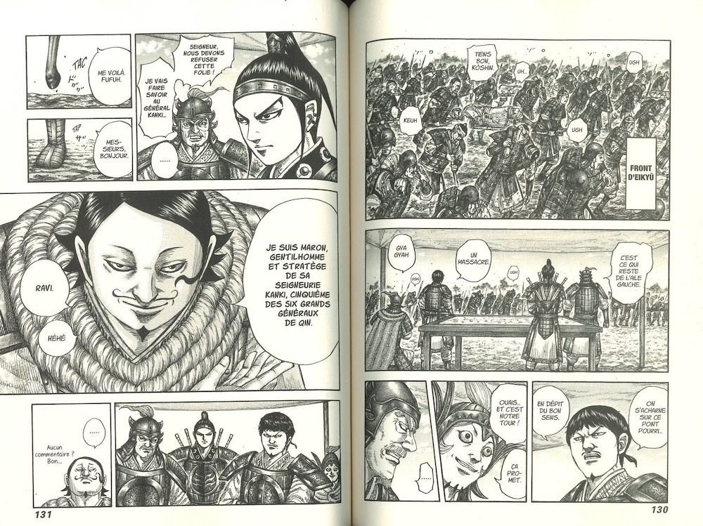 Avec Kingdom, Yashusa Hara nous a habitué à de longs Arcs scénaristiques, dans lesquels s’étalent parfois sur une centaine de chapitres une guerre. Rien de tout cela ici : l’arc « La guerre des 3 états » a été composé en 13 chapitres seulement. Certes, on aurait aimé avoir à suivre des rebondissements, des contres comme lors de lu Mega-Arc récent « Zhaô », mais l’essentiel n’est pas là : notre mangaka a préféré mettre en lumière un général ennemi, Manu, qui fut trahi par son propre souverain lorsqu’il défendait les frontières de son petit état de Beki face à l’envahisseur Chu. Ce général invaincu et craint par tous vit ainsi s’éteindre totalement son état, et vit sa conscience s’effondrer lorsqu’il se rendit compte que les troupes de Chu qu’il combattait toujours alors que son Roi avait rendu les armes étaient ses propres compagnons ! Magnifiquement conté, voici sans nul doute un autre aspect que l’on aime dans ce manga : Face à l’horreur des guerres, les destins et les consciences de grands hommes se retrouvent emportés par une lame de fond qui dépasse totalement leur simple personne…