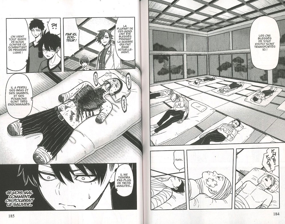 Le style graphique est lui vraiment original, tant la manifestation des pouvoirs des Momotarô (une brume de germes noires) et celle des Oni (un aggloméra visqueux de sang) tranche avec ce que l’on voit d’habitude.