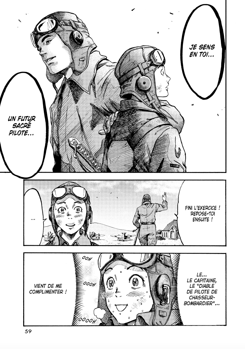 Lorsque nous ouvrons le livre, on est mis directement face à la scène où Sasaki Tomoji se sacrifie à bord de son avion. On pourrait croire que l'on rentre dans l'action directement mais non... Deux pages plus tard, nous voilà dans un flashback de son enfance.