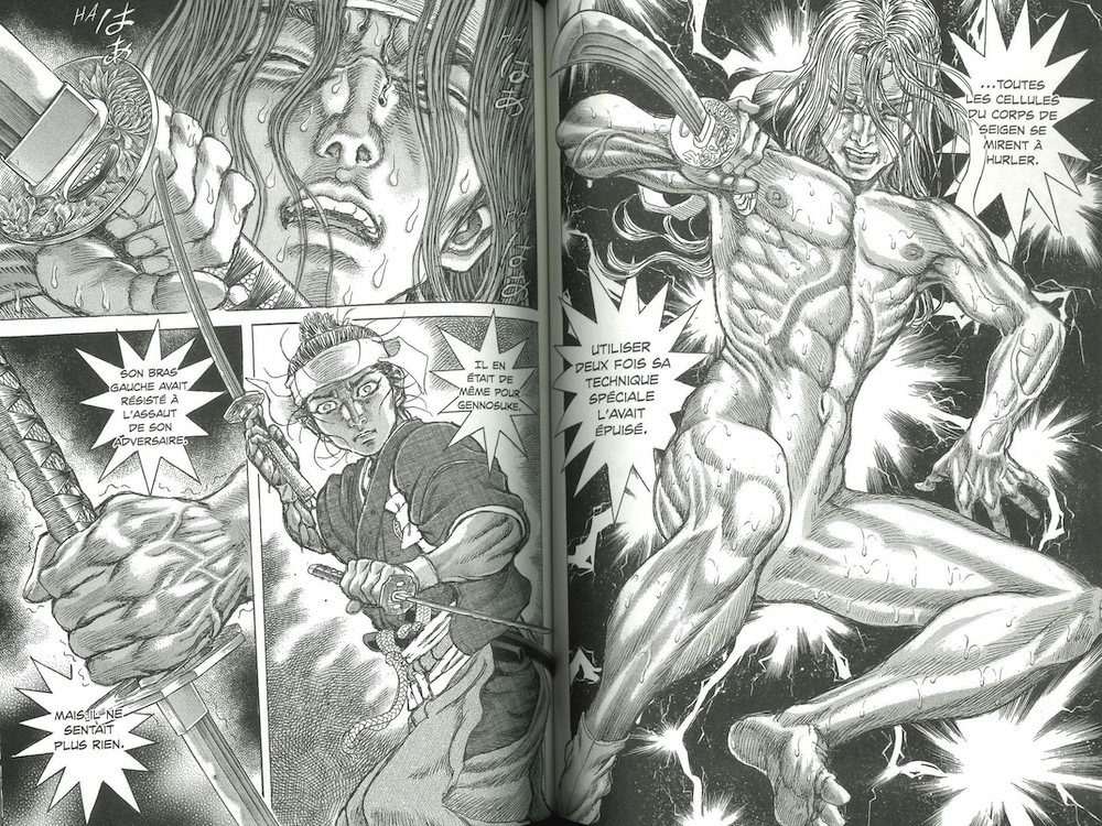 Cependant, les fans crieront un tonitruant « Enfin ! » C’est en effet dans ce 6ème tome que l’auteur nous délivre « enfin » le fabuleux duel tant attendu ! La récompense à notre patience de lecteur est à la hauteur : ce duel -qui n’aura duré que 3 passes d’armes- se révèle exceptionnel : une tension extrême se dégage des planches, grâce à un fieffé sens de la mise en page mais aussi et surtout grâce à un graphisme anthropomorphiste du pure folie !!! Les représentations des poses, de la fureur de nos samouraïs se révèlent totalement folles, avec des détails dans la musculature de pure folie…. Et si les coups portés par les maitres sont chirurgicaux, il en est de même dans leurs retranscriptions visuelles, d’une réalité anatomique incroyable.