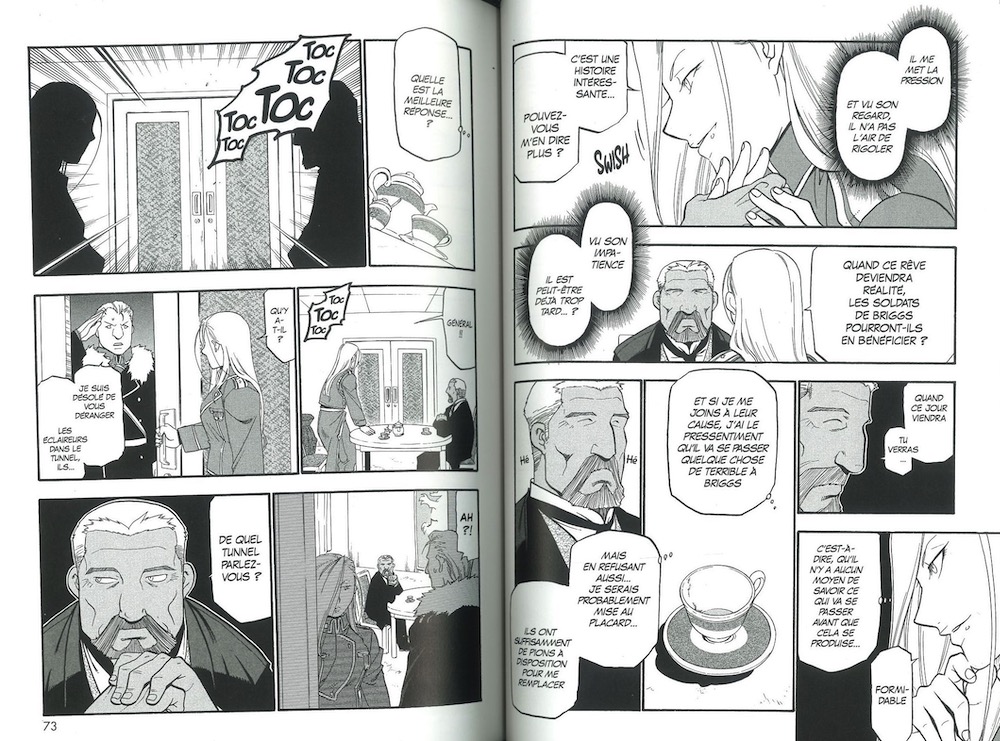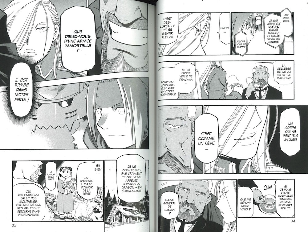 L’auteure nous délivre dans les 2 derniers chapitres un magnifique jeu de dupes. A nous de découvrir qui dupe réellement qui. Excellent tome donc, qui n’a qu’un seul défaut : se terminer sur l’arrivée de Kimblee sur le champ de bataille, face à Scar… on devra donc attendre pour avoir réponse à cette cruciale question !